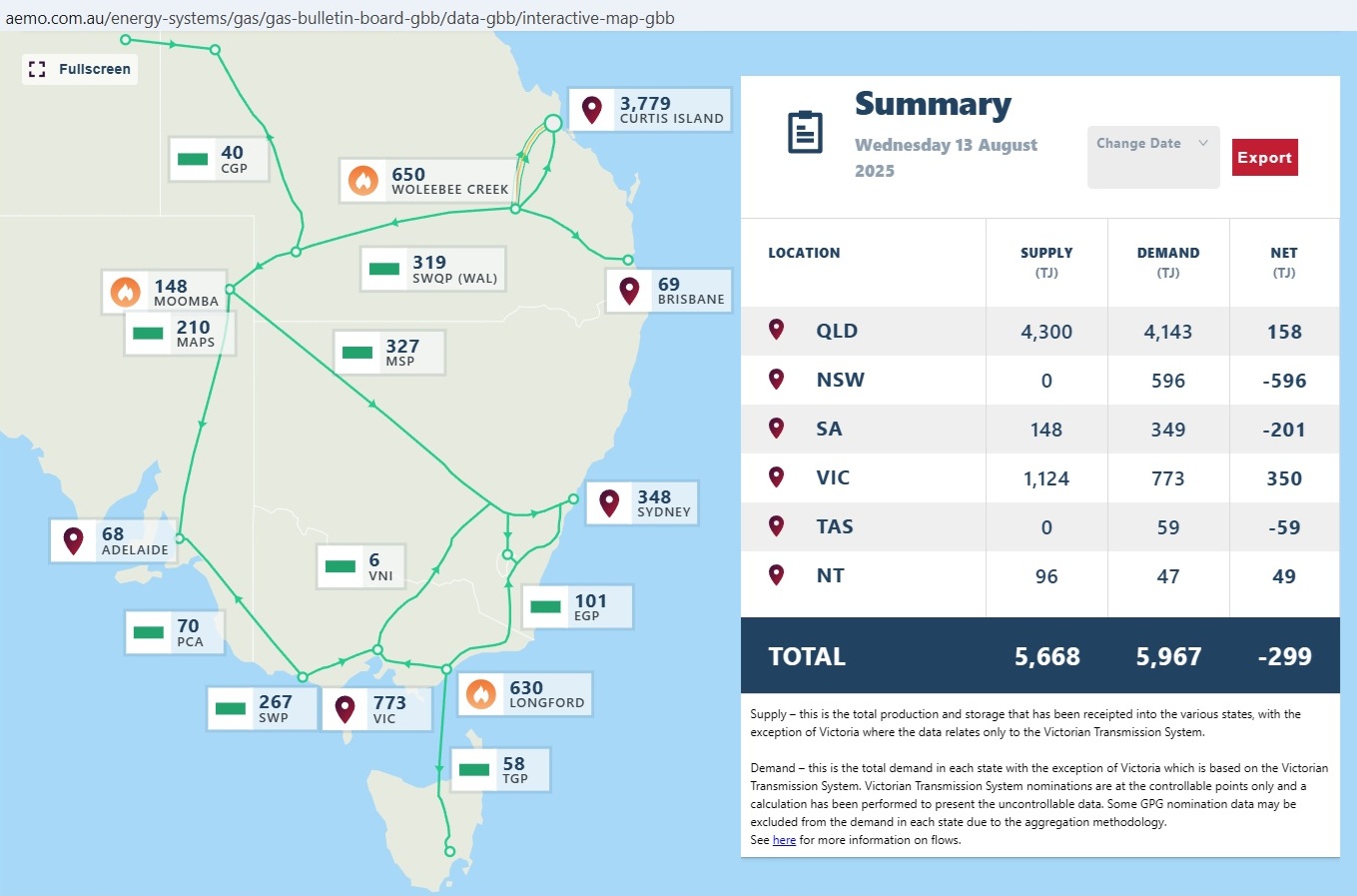 Fig 7: East coast gas flows in August 2025