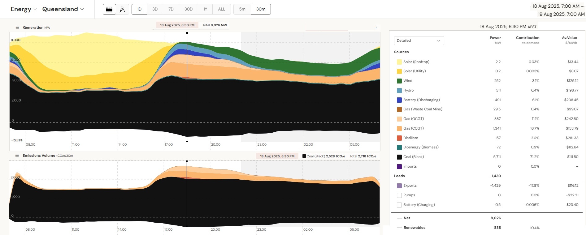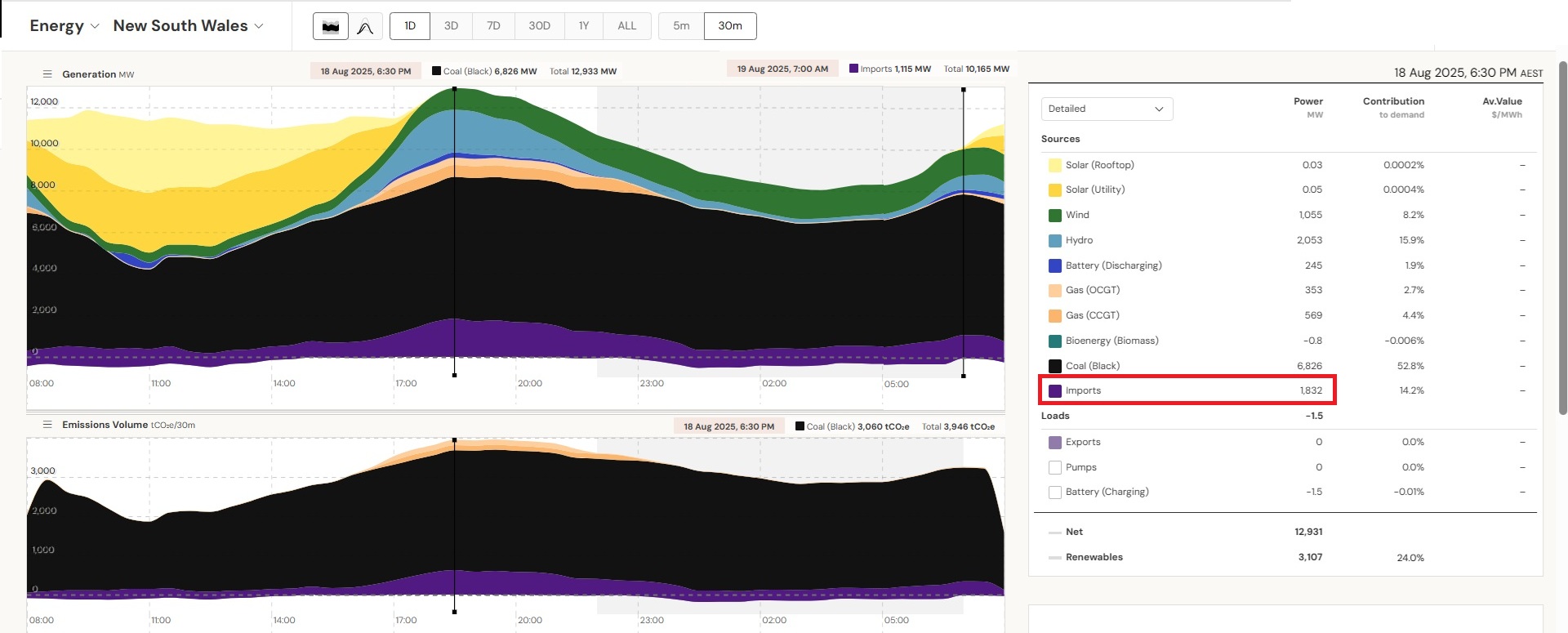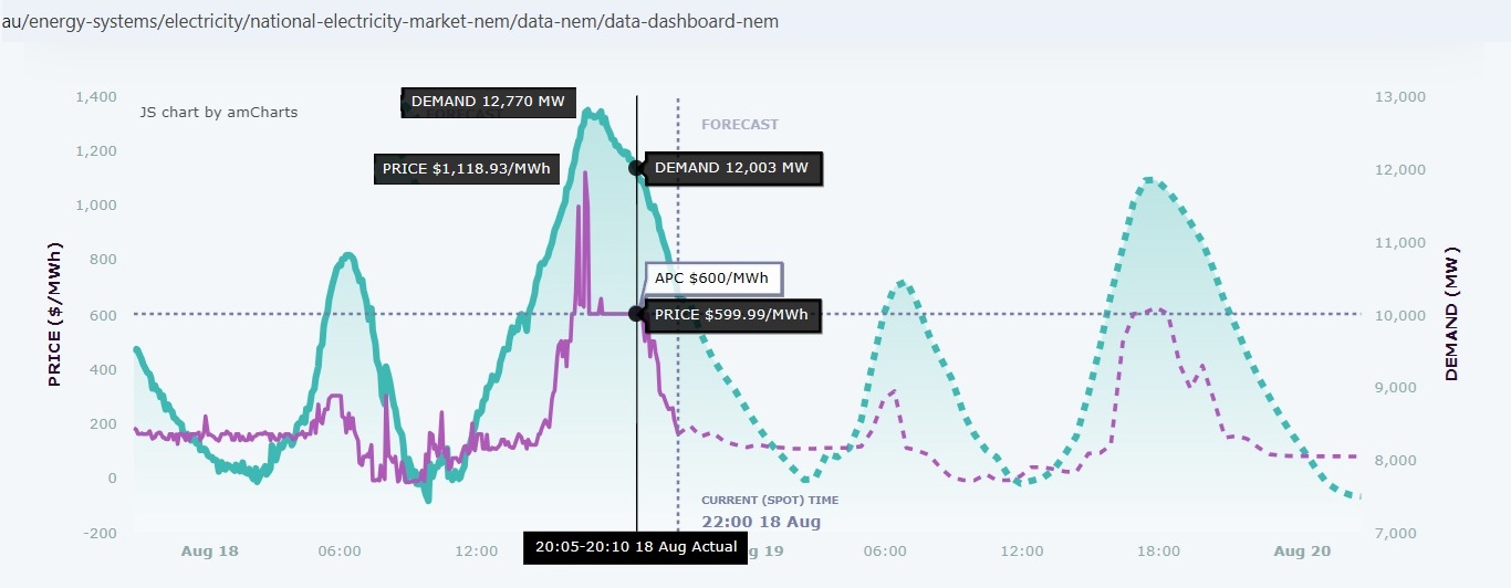 High imports of 1,832 MW at 6:30 pm, much of which from Queensland where power supplies were also tight (battery discharge 491 MW)