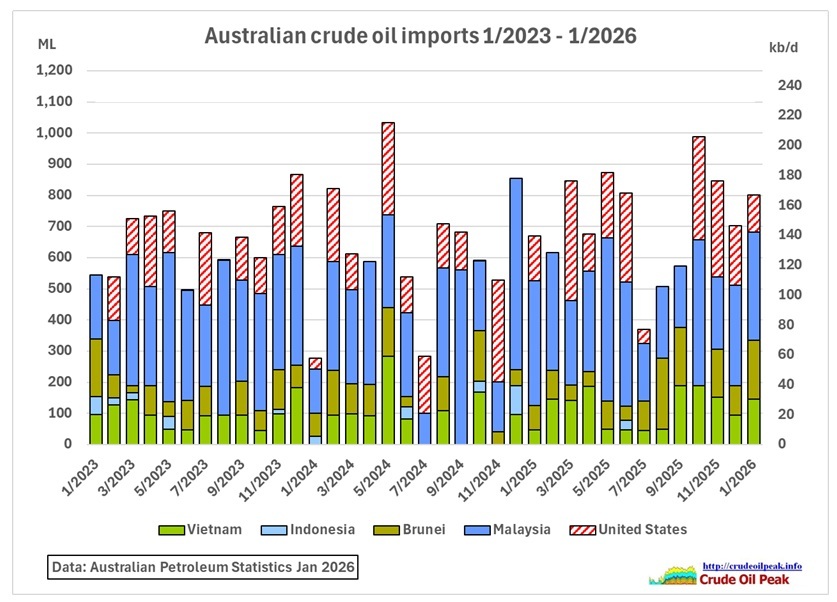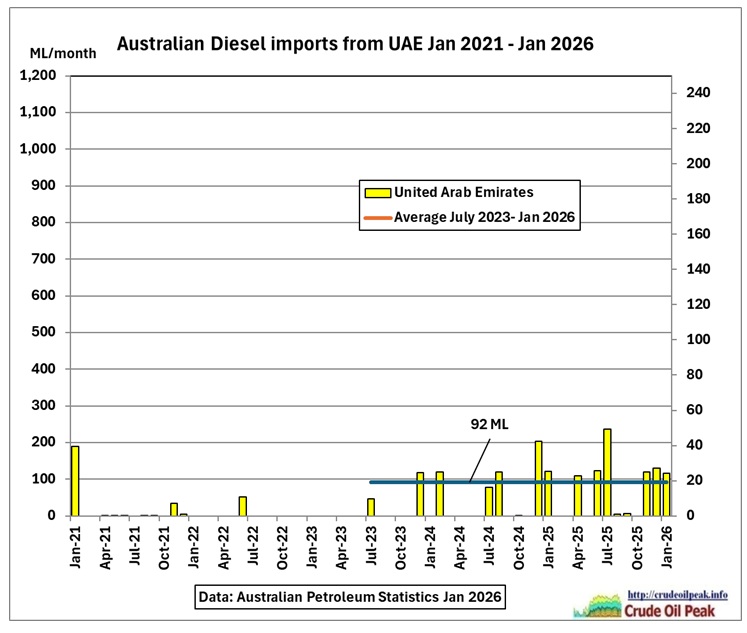 Over the last 3 years Australia imported only negligible volumes of crude oil from the Middle East (UAE).