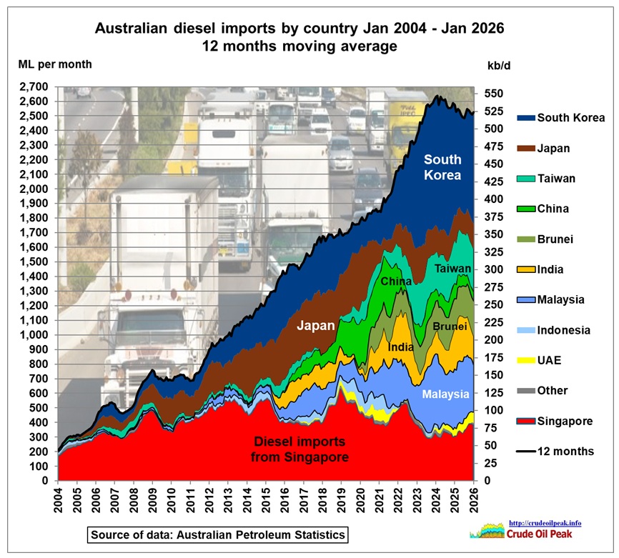 Fig 1: Australian diesel imports by country. Stacked