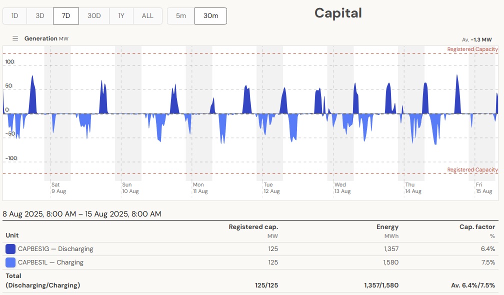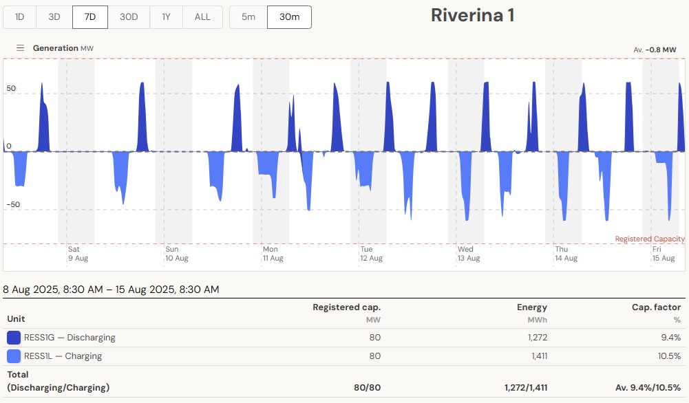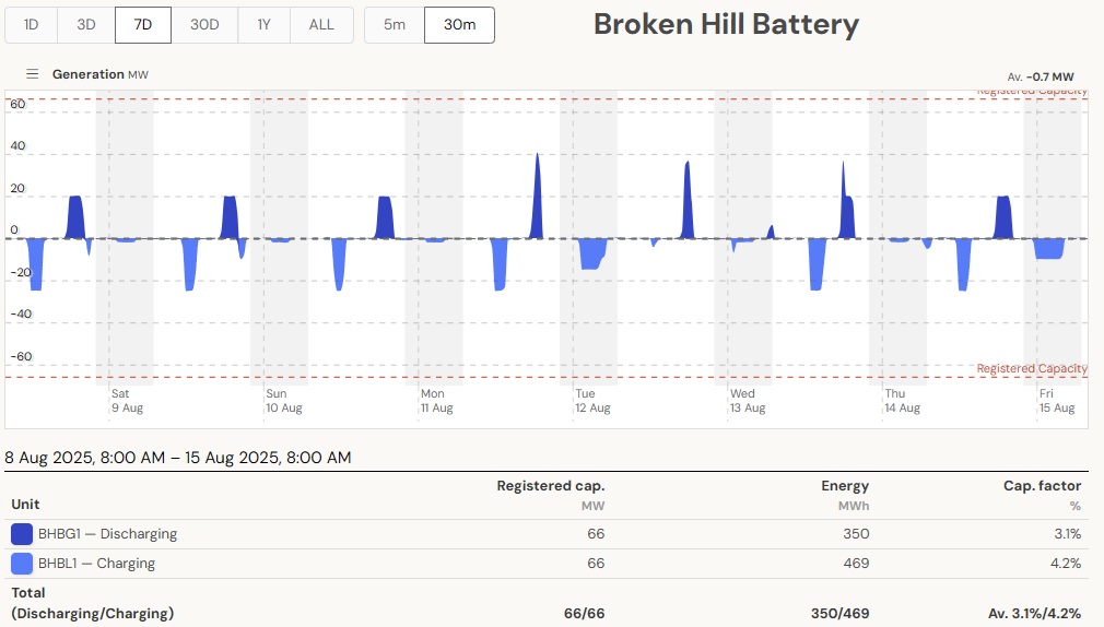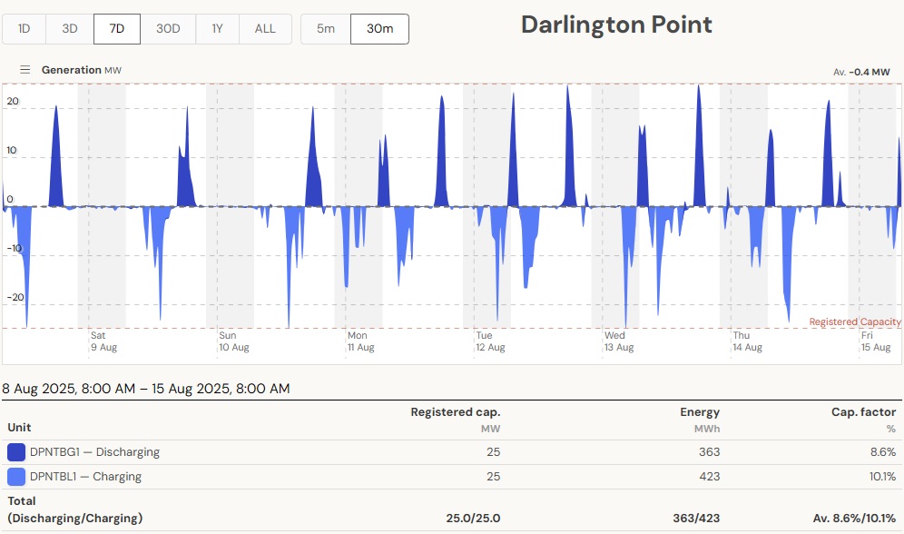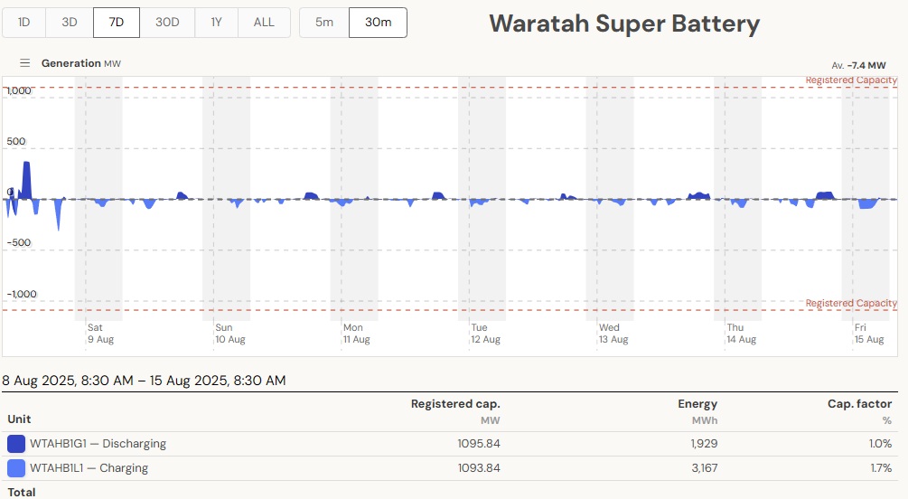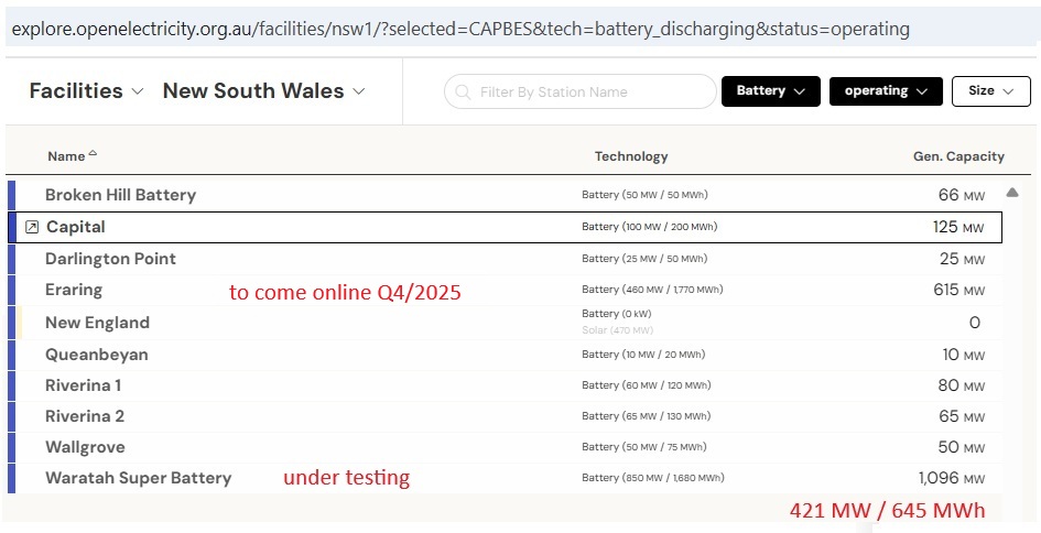 The current set of batteries in operation have short, daily and even half-daily charge/discharge cycles to function as peaking plants. The average daily discharge of 0.65 GWh is small compared to the generation of just 1 Eraring unit of 14 GWh/day. Battery capacity would need to be ramped up considerably to make any contribution to replace a coal plant running continuously. The next batteries Eraring and Waratah to come online are big and will bring some improvement. And there are many committed projects. So the above calculations have to be updated regularly, also depending on the season. The bottom line, however, is that that system must work at all times, also on windless winter days/nights like on the 13th of August 2025.