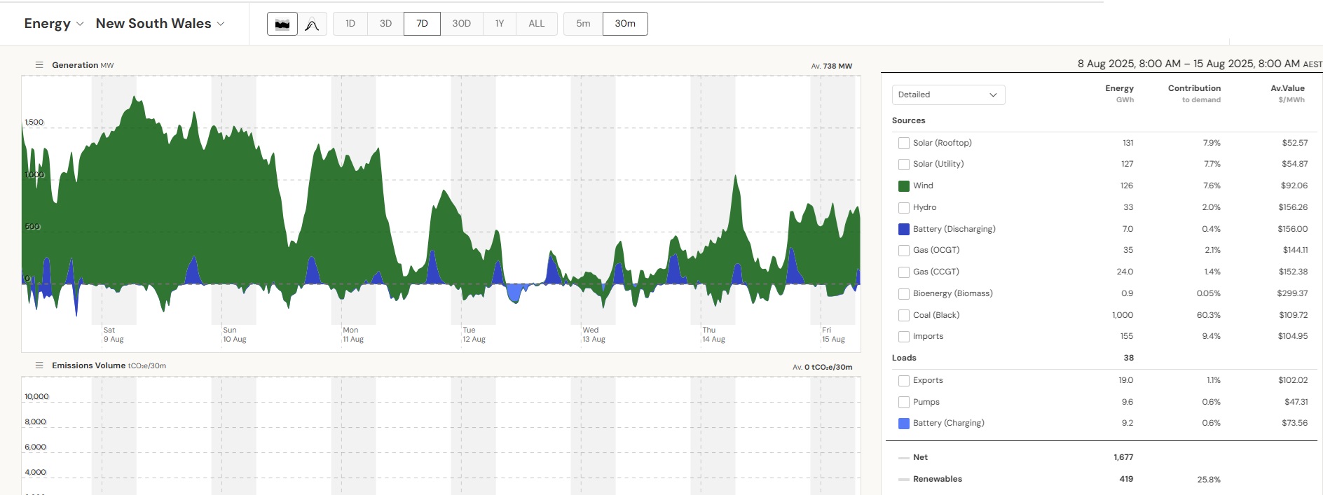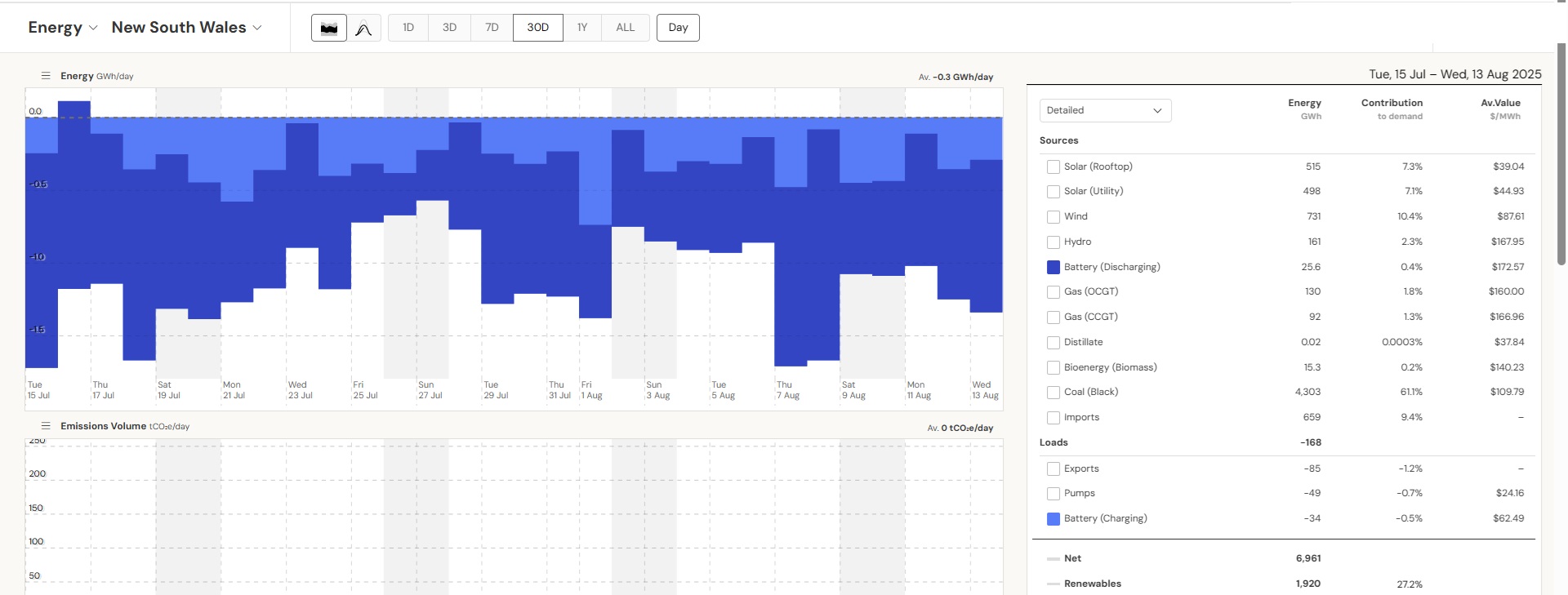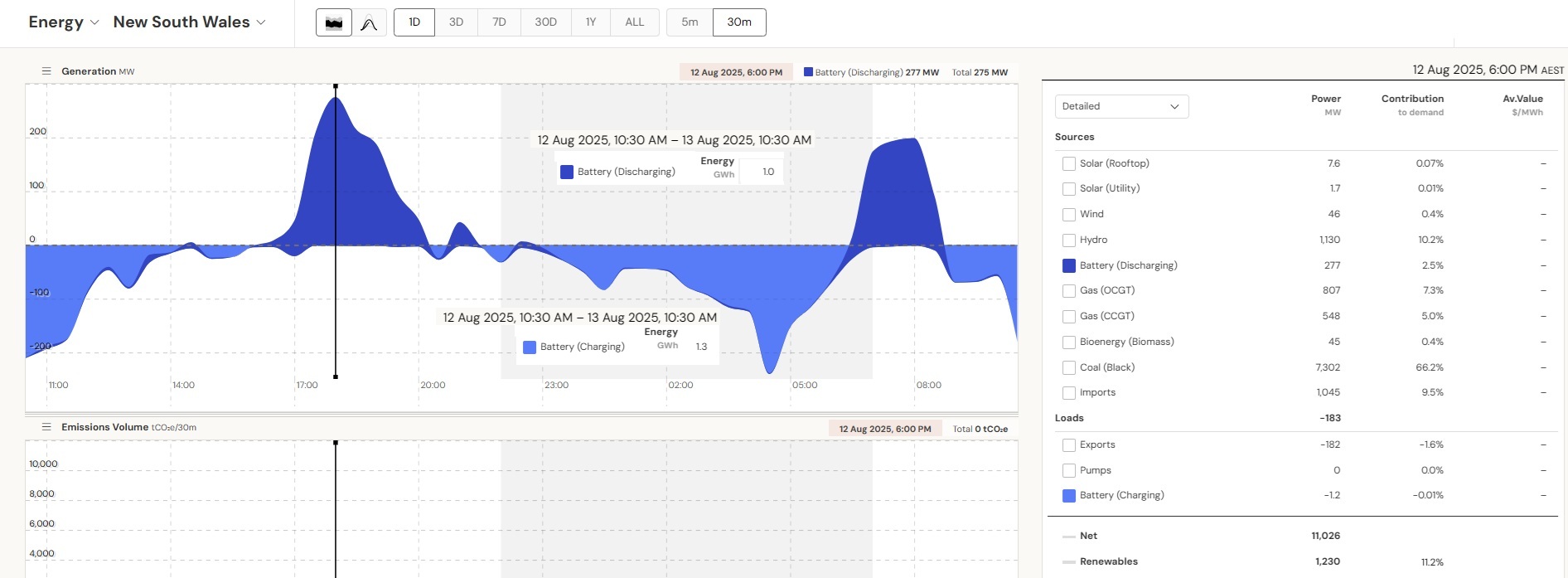 The current set of batteries in operation have short, daily and even half-daily charge/discharge cycles to function as peaking plants. The average daily discharge of 0.65 GWh is small compared to the generation of just 1 Eraring unit of 14 GWh/day. Battery capacity would need to be ramped up considerably to make any contribution to replace a coal plant running continuously. The next batteries Eraring and Waratah to come online are big and will bring some improvement. And there are many committed projects. So the above calculations have to be updated regularly, also depending on the season. The bottom line, however, is that that system must work at all times, also on windless winter days/nights like on the 13th of August 2025.