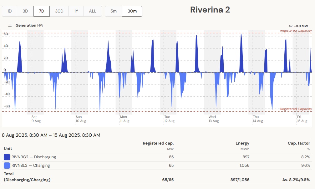 Most batteries show 2 charging/discharging cycles per day in 5 of 7 days. As an example, here is the summary of all batteries in NSW on 12/13th August:
